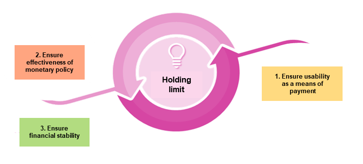 36. These three objectives naturally lead to a trade-off: the holding limit should be set sufficiently high to avoid impairing users’ ability to use the digital euro as a convenient means of payment and to preserve the role of central bank money in the future, yet not so high as to jeopardise the stability of the financial system or smooth monetary policy implementation and transmission. In addressing all three objectives simultaneously, the methodology adheres to the principle of proportionality, as enshrined in Article 5(4) of the Treaty on European Union and explicitly referenced in Recital 32 of the draft Regulation on the establishment of the digital euro. Pursuant to this principle, restrictions in EU legislation on the "store of value" function of public money (one of the three key functions of money) should be necessary, appropriate and the least intrusive measure required to achieve the objectives of the Treaty, including maintaining financial stability and supporting the effectiveness of monetary policy. Similarly, limitations on individuals’ freedom to hold significant amounts of digital euro (a freedom that is considered unrestricted for cash) should be proportionate to these objectives.