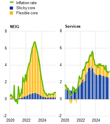 Sticky core inflation in the euro area has eased only gradually, while flexible core inflation has returned closer to its pre-pandemic average. Sticky core inflation, as measured by the weighted mean of sticky HICP items, has remained relatively persistent in recent months, hovering around 3.6% (Chart B, panel a). By contrast, flexible core inflation – which is more volatile and rose strongly during the inflation surge – started to decline earlier and has now fallen back closer to its pre-pandemic level, standing at 1.2% in September 2025. Flexible core items also displayed a higher degree of frontloading in price adjustments: for this category, 85% of items recorded their inflation peak before March 2023, which is when HICPX inflation reached its maximum. In comparison, only 41% of sticky core items had already peaked by that time.