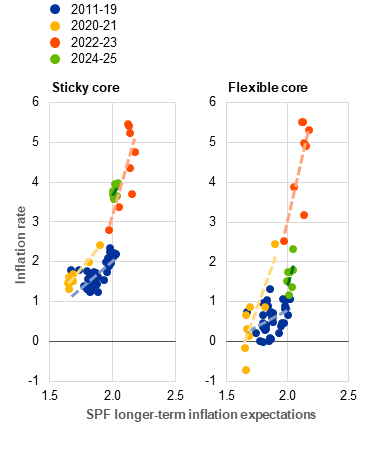 Sticky core inflation in the euro area appears more closely linked to inflation expectations. A scatter plot of sticky and flexible core inflation against longer-term inflation expectations from the ECB’s Survey of Professional Forecasters (SPF) shows that during the low-inflation period of 2011-19 sticky core inflation clustered tightly between 1% and 2.5%, close to SPF expectations (Chart C, panel b). By contrast, flexible core inflation was more dispersed, ranging from negative rates to well above 1%. This finding is reinforced by estimates of quarterly New Keynesian Phillips curve specifications for each indicator, including its lagged value, the unemployment gap, inflation expectations (two years ahead and longer term) and import prices.[5] Both medium and longer-term expectations significantly explain sticky core inflation, while they are insignificant for its flexible counterpart.