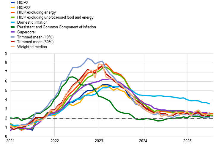 Euro area headline inflation, as measured by the Harmonised Index of Consumer Prices (HICP), continues to stand close to the Governing Council’s 2% medium-term target. According to Eurostat’s flash estimate, it edged up to 2.1% in August 2025, from 2.0% in July.[3]This increase was mainly driven by a rise in energy inflation, which more than offset a decline in food inflation. HIPC inflation excluding energy and food (HICPX) was unchanged, reflecting a decline in services inflation and stable non-energy industrial goods (NEIG) inflation. Measures of underlying inflation remain consistent with the ECB’s 2% medium-term target. Wage growth continues to moderate, with year-on-year growth in compensation per employee declining to 3.9% in the second quarter of 2025, down from 4.0% in the previous quarter and 4.8% in the second quarter of last year, as well as from 5.7% in the second quarter two years ago. Most measures of longer-term inflation expectations continue to stand at around 2%, supporting the stabilisation of inflation around the ECB’s target.
