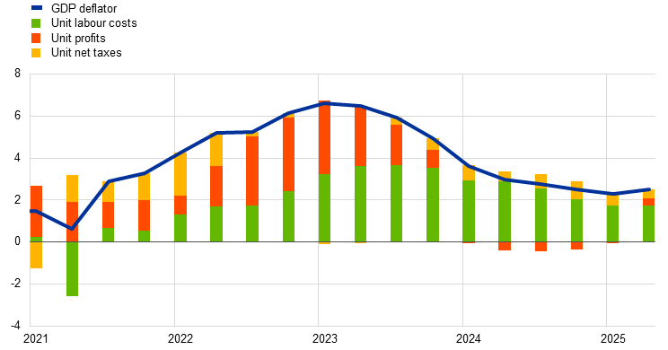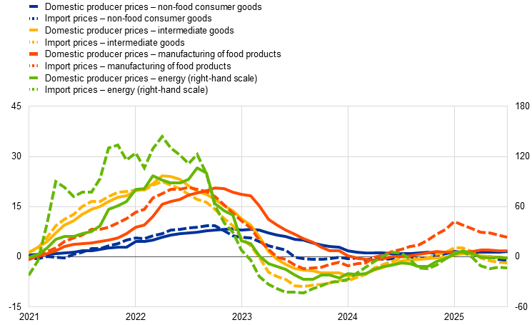 Indicators of underlying inflation remain consistent with the Governing Council’s 2% medium-term target. Year-on-year growth in compensation per employee was 3.9% in the second quarter, down from 4.0% in the previous quarter and 4.8% in the second quarter of 2024. Forward-looking indicators, including the ECB’s wage tracker and surveys on wage expectations, suggest that wage growth will moderate further. Along with productivity gains, this will help keep a lid on domestic price pressures, even as profits recover from low levels.