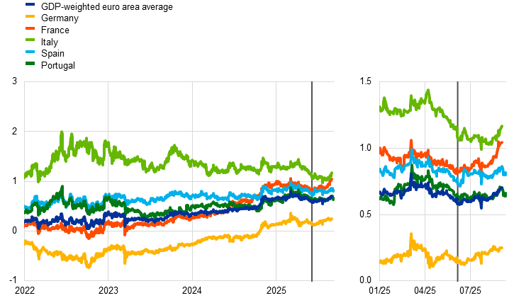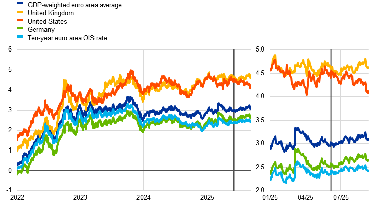 Since the Governing Council’s monetary policy meeting in July 2025 short-term market rates have increased, while longer-term rates have remained broadly unchanged. However, the Governing Council’s past interest rate cuts continued to lower corporate borrowing costs in July. The average interest rate on new loans to firms moved down to 3.5% in July, from 3.6% in June. The cost of issuing market-based debt was unchanged, at 3.5%. Loans to firms grew by 2.8%, slightly more strongly than in June, while the growth of corporate bond issuance rose to 4.1% from 3.4%. The average interest rate on new mortgages was again unchanged at 3.3% in July, while growth in mortgage lending picked up to 2.4%, from 2.2%.