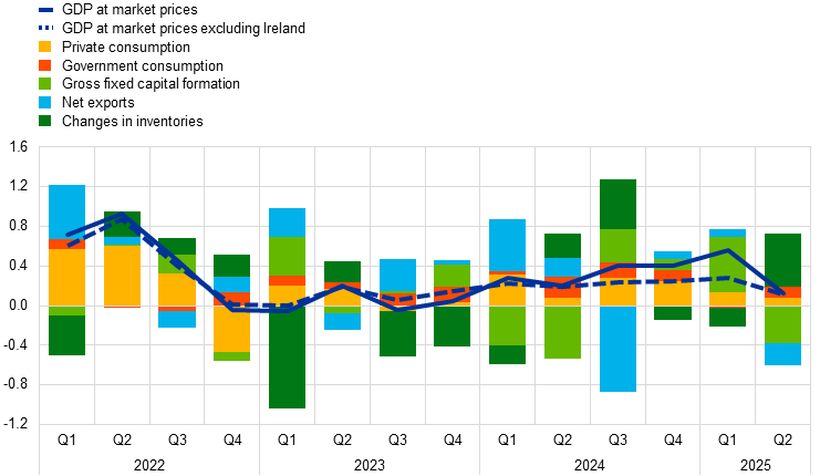 Real GDP growth slowed in the second quarter of 2025 amid persistent geopolitical and trade policy uncertainty (Chart 3). Following the strong first-quarter outcome, which was partly driven by firms frontloading exports ahead of the expected tariff hikes, GDP growth slowed in the second quarter, edging up by 0.1%, quarter on quarter, reflecting the unwinding of these effects (see Box 3 on how frontloading and uncertainty shaped recent developments). Despite higher volatility in the past two quarters (largely related to the impact from Irish data), the latest outcome marks the seventh consecutive quarter of positive growth in the euro area. The moderate expansion in euro area real GDP in the second quarter was supported by private and public consumption as well as changes in inventories. At the same time, exports and investment contracted – the latter on the back of a relatively large drop in non-construction investment, driven by developments in Irish intellectual property products. As imports displayed zero growth, net trade contributed negatively to growth in the second quarter. From a sectoral perspective, the services sector was the main contributor to growth, expanding at a similar pace to the first quarter. Meanwhile, growth in industry slowed vis-à-vis the first quarter, reflecting the unwinding of frontloading effects and tariff increases. Furthermore, value added in construction fell, amply offsetting the strong rise seen in the first quarter.