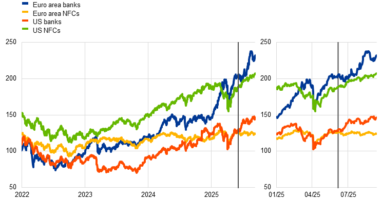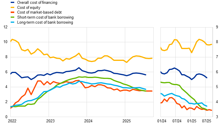 8. Owing to lags in data availability for the cost of borrowing from banks, data on the overall cost of financing for NFCs are only available up to July 2025.