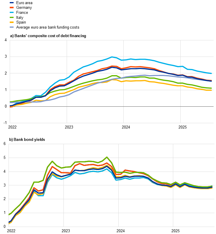 Notes: Composite bank funding costs are an average of new business costs for overnight deposits, deposits redeemable at notice, time deposits, bonds and interbank borrowing, weighted by their respective outstanding amounts. Average bank funding costs use the same weightings but are based on rates for outstanding deposits and interbank funding, and on yield to maturity at issuance for bonds. Bank bond yields are monthly averages for senior tranche bonds. The latest observations are for July 2025 for the composite cost of debt financing for banks (panel a) and 3 September 2025 for bank bond yields (panel b).