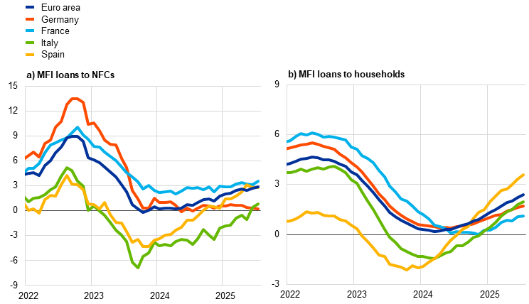 Notes: Loans from monetary financial institutions (MFIs) are adjusted for loan sales and securitisation; in the case of non-financial corporations (NFCs), loans are also adjusted for notional cash pooling. The latest observations are for July 2025.