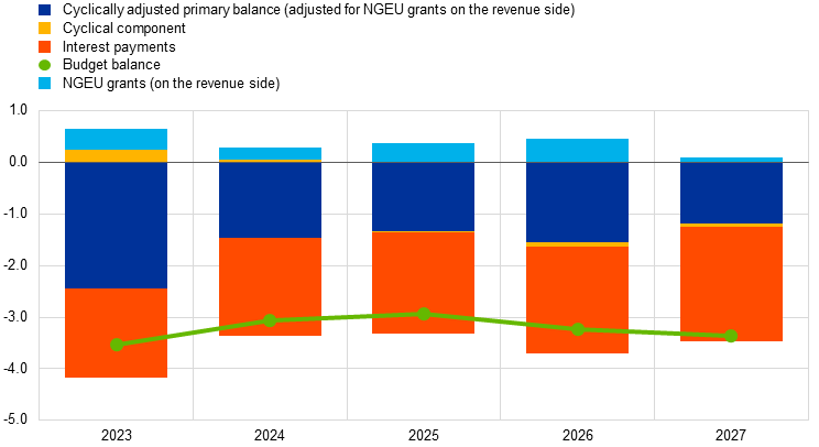 According to the September 2025 ECB staff macroeconomic projections for the euro area, the general government budget deficit, which stood at 3.1% of GDP in 2024, is estimated to decline to 2.9% in 2025 and then increase substantially to 3.4% of GDP in 2027. The euro area fiscal stance is projected to tighten only slightly in 2025, loosen in 2026 and then tighten again, somewhat more strongly, in 2027. The projected loosening in 2026 is mainly on account of higher public investment. The tightening in 2027 reflects primarily lower assumed government spending related to the discontinuation of the grants offered under the Next Generation EU (NGEU) programme. The euro area debt-to-GDP ratio is on an increasing path and projected to reach just under 90% of GDP by 2027, as the continuous primary deficits and positive deficit-debt adjustments more than offset favourable interest rate-growth differentials.