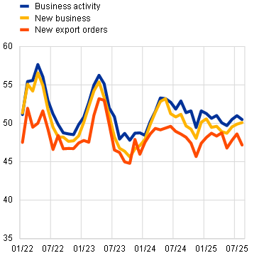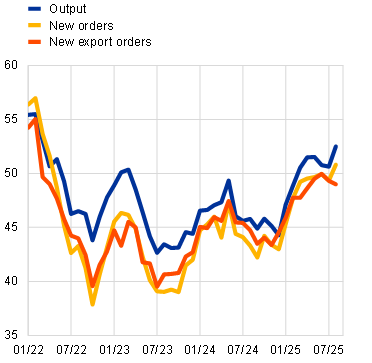 Survey data are sending somewhat mixed signals, but overall point to a continued modest expansion in activity in the third quarter of 2025. The still elevated level of uncertainty, higher tariffs and the appreciation of the euro are weighing on the short-term outlook. The composite output Purchasing Managers’ Index (PMI) rose to 51.0 on average in July and August (from 50.4 in the second quarter), indicating slow growth at around the same rate as in the second quarter. While growth in services is assessed to have slowed, it is still expected to be the main driver of growth, chiefly reflecting its larger size compared with the industrial sector. Meanwhile, activity in the manufacturing sector, which was more dynamic at the beginning of the year owing to the frontloading of exports in advance of higher tariffs, is expected to be more muted in the near term – although the latest readings show some improvement (Chart 4). The PMI for new orders portrays a similar picture, with overall slow dynamics. However, this indicator, which is more forward looking by nature, shows a somewhat more subdued improvement going into the fourth quarter of the year.