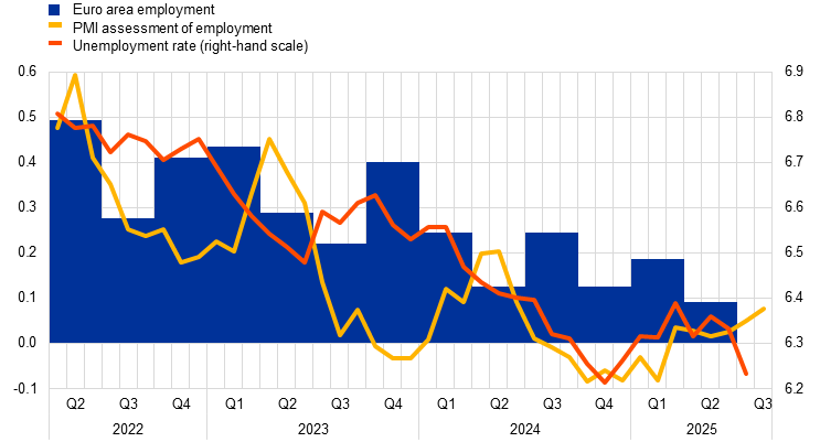 Notes: The two lines indicate monthly developments, while the bars show quarterly data. The PMI is expressed in terms of the deviation from 50, then divided by 10 to gauge the quarter-on-quarter employment growth. The latest observations are for the second quarter of 2025 for euro area employment, August 2025 for the PMI assessment of employment and July 2025 for the unemployment rate.