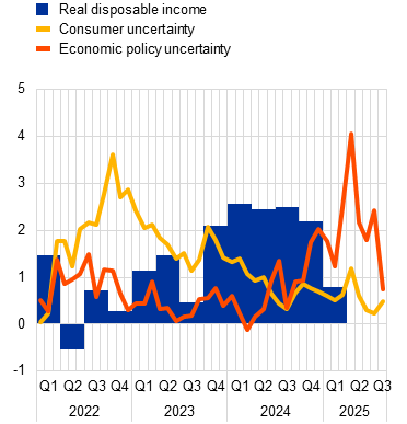 Notes: Business expectations for demand in retail trade (excluding motor vehicles) and for demand in consumption-weighted services refer to the next three months. “Consumption services demand” is based on the expected sectoral demand indicators of the European Commission’s business survey of services, weighted according to the sectoral shares in domestic private consumption from the FIGARO input-output tables for 2022. The consumption services demand series is standardised for the period from 2005 to 2019, consumer uncertainty and economic policy uncertainty are standardised for the period from April 2019 to August 2025 with respect to their averages for 2019, owing to data availability, while all other series are standardised for the period from 1999 to 2019. The economic policy uncertainty indicator is the GDP-weighted average of the standardised country series for Germany, France, Italy and Spain. The latest observations are for the second quarter of 2025 for private consumption, the first quarter of 2025 for real disposable income and August 2025 for all other items.