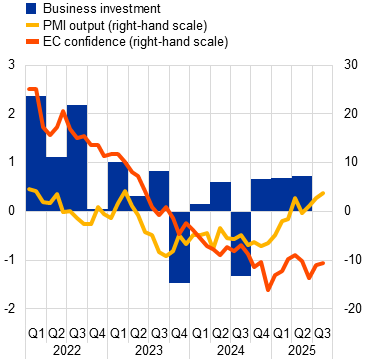 Business investment grew robustly in the second quarter of 2025 but is expected to slow in the second half of the year. Following growth of 0.7%, quarter on quarter, in both the first and the second quarter of 2025, euro area non-construction investment (excluding Irish intangibles) is expected to be muted in the coming quarters. Capital goods surveys available up to August are somewhat mixed, with PMI output moving further above 50, yet the European Commission’s sentiment index points to weak activity. While domestic demand is supportive, other drivers of investment confirm the short-term weakness. For instance, uncertainty has remained elevated despite declining somewhat after the US-EU trade deal at the end of July and the non-financial corporate gross operating surplus rose modestly in the first quarter after seeing negative rates last year. In addition to higher tariffs, earnings calls reveal some possible adverse impact of the euro’s appreciation on firms’ profits. These factors could dampen investment depending on how firms hedge against currency risk, diversify activity and adjust their margins. In this context, euro area bankruptcies rose further in the second quarter of 2025, standing about 25% above their 2019 level. This reflects both a necessary market adjustment in a period of structural change – as business registrations also grew to levels considerably above pre-pandemic levels – and weaker economic conditions. Beyond the short term, higher demand and spillovers from rising defence spending are seen to spur investment.