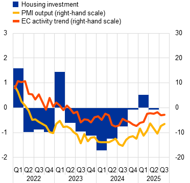 Notes: The lines indicate monthly developments, while the bars refer to quarterly data. The PMIs are expressed in terms of the deviation from 50. In panel a), business investment is measured by non-construction investment excluding Irish intangibles. Short-term indicators refer to the capital goods sector. In panel b), the line for the European Commission’s activity trend indicator refers to the weighted average of the building and specialised construction sectors’ assessment of the trend in activity compared with the preceding three months. The line for PMI output refers to housing activity. The latest observations are for the second quarter of 2025 for investment and August 2025 for all other items.
