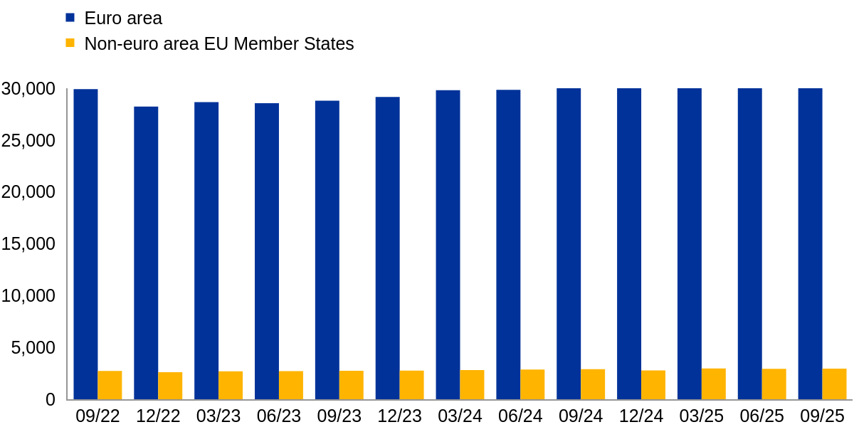 - The aggregate of total assets of EU-headquartered credit institutions increased by 0.95%, from €33.12 trillion in September 2024 to €33.44 trillion in September 2025
