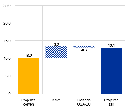 Ve srovnání s projekcemi z června 2025 jsou po obchodní dohodě mezi USA a EU a dalších oznámeních efektivní celní sazby USA na dovoz z eurozóny i ze zemí všech ostatních obchodních partnerů vyšší. Projekce našich odborníků berou tyto celní sazby, jejich dočasné neuplatňování a výjimky v úvahu ke dni uzávěrky údajů pro projekce (28. srpna) a předpokládají, že po celý horizont projekcí zůstanou na stejné úrovni.