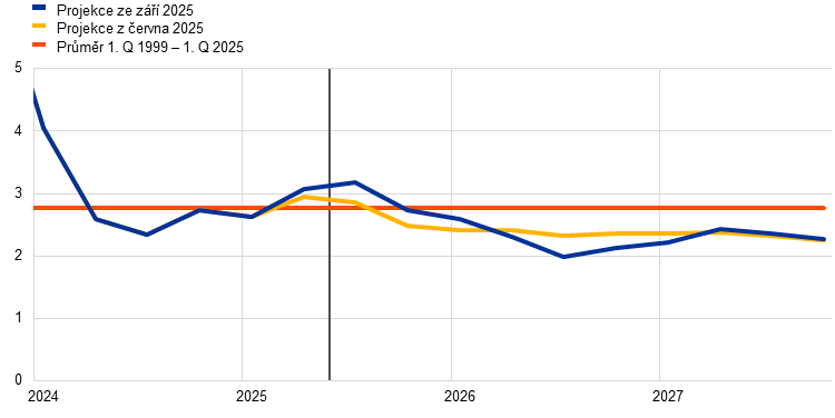 Výhled inflace odpovídá tomu, že se inflace stabilizuje poblíž 2% střednědobého cíle. Celková inflace, měřená harmonizovaným indexem spotřebitelských cen (HICP), by měla po zbytek roku 2025 kolísat poblíž 2 %, v roce 2026 klesnout na 1,7 % a následně se v roce 2027 zotavit na úroveň 1,9 %. Pokles v roce 2026 odráží další postupné snižování cen neenergetických složek, zatímco růst cen energií by měl zůstat volatilní, ale v horizontu projekcí by měl zesílit, částečně v důsledku spuštění systému EU pro obchodování s emisemi ETS2 v roce 2027. Očekává se, že ceny potravin zpočátku i nadále porostou rychleji, neboť se projeví zpožděné dopady dřívějšího růstu cen mezinárodních potravinářských komodit. V letech 2026 a 2027 by však růst měl zmírnit na úroveň mírně nad 2 %. Inflace měřená HICP bez započtení energií a potravin (HICPX) by měla klesat s tím, jak poleví mzdové tlaky a zmírní se růst cen služeb a jak se posilování eura projeví v cenovém řetězci a omezí růst cen zboží. Očekává se, že nižší růst mezd vyplývající z již realizované kompenzace ztrát reálných mezd v minulosti a oživení růstu produktivity povedou k výrazně pomalejšímu růstu jednotkových mzdových nákladů. V porovnání s projekcemi z června 2025 byl výhled celkové inflace měřené HICP revidován pro rok 2025 i 2026 o 0,1 procentního bodu směrem nahoru. Důvodem jsou vyšší aktuální údaje o cenách energetických komodit i předpoklady o jejich budoucím vývoji a také zpožděné účinky vyšších mezinárodních cen potravinářských komodit, které převažují nad posílením eura. Očekává se, že v roce 2027 budou převládat zpožděné účinky posilování eura, což povede k revizi o 0,1 procentního bodu směrem dolů.