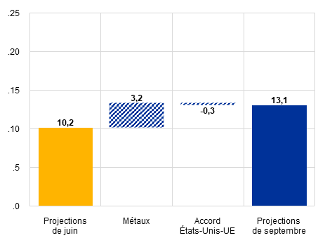 - Le taux effectif des droits de douane pour les exportations de biens de la zone euro vers les États-Unis est supposé être de 13,1 %, contre 10,2 % dans les projections de juin (graphique A, partie a). Ce taux tient compte de l’accord commercial du 27 juillet 2025 et de la déclaration conjointe ultérieure des États-Unis et de l’UE, qui prévoit l’application du taux le plus élevé entre le taux tarifaire de 15 % et celui de la nation la plus favorisée (NPF) pour tous les biens qui ne sont pas concernés par des droits de douane sectoriels. À titre de comparaison, le taux forfaitaire supposé dans les projections de juin 2025 était de 10 %. Les droits de douane sectoriels comprennent des droits de douane plus élevés sur l’acier et l’aluminium (passant de 25 % dans les projections de juin à 50 %) et un nouveau droit de douane de 50 % sur la teneur en aluminium et en acier de 407 produits, ainsi que sur le cuivre plus largement. Les voitures et les pièces automobiles sont soumises à un taux de 15 % (contre 25 % dans les projections de juin), tandis que seul le taux NPF s’applique désormais aux aéronefs et pièces pour aéronefs[4]. Pour les produits faisant actuellement l’objet d’une investigation au titre de la section 232, à savoir les produits pharmaceutiques, les semi-conducteurs et le bois, le taux supposé est celui appliqué avant l’entrée en fonction de l’administration Trump, soit un taux proche de zéro. En outre, s’agissant des échanges de services, le taux effectif des droits de douane a augmenté de 1,8 point de pourcentage, à 8,1 %, par rapport à son niveau dans les projections de juin.