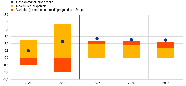 La croissance du PIB en volume devrait continuer d’être tirée par la consommation privée. Du point de vue des dépenses (graphique 2, partie a), la consommation privée progresserait nettement sur l’ensemble de l’horizon, apportant la contribution la plus importante à la croissance du PIB en volume. En outre, la consommation publique et l’investissement total augmenteraient chaque année de 2025 à 2027, l’investissement privé venant compenser le fort effet de falaise attendu sur l’investissement public en 2027 à la suite de l’expiration des subventions accordées au titre du programme NGEU. Les exportations nettes devraient à l’inverse apporter des contributions négatives à la croissance du PIB en volume en 2025 et 2026, la contribution des importations (-1,2 point de pourcentage et ‑0,9 point de pourcentage respectivement) excédant celle des exportations (0,6 point de pourcentage et 0,5 point de pourcentage respectivement) ; cet effet est toutefois partiellement compensé par une contribution positive des variations de stocks en 2025 (graphique 2, partie b). La forte volatilité des variations de stocks tout au long de 2025 est liée à la constitution de stocks et au déstockage, dans le contexte des effets d’anticipation et de leur dissipation progressive.