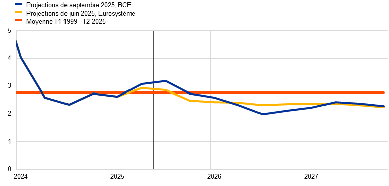 Les perspectives d’inflation sont cohérentes avec une stabilisation de l’inflation autour de l’objectif de 2 % à moyen terme. L’inflation totale, telle que mesurée par l’indice des prix à la consommation harmonisé (IPCH), devrait rester stable, autour de 2 %, pour le reste de 2025, puis diminuer à 1,7 % en 2026 avant de se redresser à 1,9 % en 2027. La baisse en 2026 reflète un nouveau ralentissement progressif des composantes hors énergie, tandis que la hausse des prix de l’énergie devrait rester volatile, mais s’accentuer sur l’horizon de projection, en partie en raison du système d’échange de quotas d’émission de l’UE 2 (SEQE-UE 2), qui démarrera en 2027. L’inflation alimentaire devrait dans un premier temps rester élevée, en raison de la transmission des effets décalés des hausses antérieures des prix des matières premières alimentaires à l’échelle internationale, mais se modérer à des taux légèrement supérieurs à 2 % en 2026 et 2027. L’inflation mesurée par l’IPCH hors énergie et produits alimentaires (IPCHX) devrait ralentir à mesure que les tensions sur les salaires diminuent, que la hausse des prix des services se modère, et que l’appréciation de l’euro se transmet le long de la chaîne des prix et freine le renchérissement des biens. Le ralentissement de la croissance des salaires, les pertes antérieures de salaire réel ayant été compensées, associé à une reprise de la croissance de la productivité, devrait entraîner une nette décélération de la croissance des coûts unitaires de main-d’œuvre. Par rapport aux projections de juin 2025, les perspectives relatives à la hausse de l’IPCH total ont été révisées à la hausse de 0,1 point de pourcentage pour 2025 et 2026 en raison de résultats et d’hypothèses plus élevés concernant les prix des matières premières énergétiques, ainsi que d’effets décalés résultant de l’augmentation des prix des matières premières alimentaires à l’échelle internationale, qui ont plus que compensé l’appréciation de l’euro. Pour 2027, les effets décalés de l’appréciation de l’euro devraient être prédominants, entraînant une révision à la baisse de 0,1 point de pourcentage.