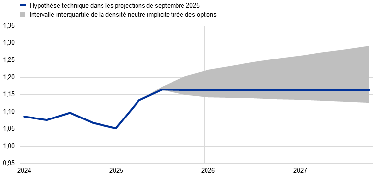 Cette analyse de sensibilité évalue les implications d’autres trajectoires du taux de change, qui suggèrent la possibilité de nouvelles tensions à la hausse sur l’euro et, par conséquent, indiquent des risques à la baisse pour la croissance et l’inflation. Les hypothèses techniques relatives aux taux de change retenues dans les projections de référence sont maintenues constantes sur l’horizon de projection. D’autres trajectoires à la baisse et à la hausse sont tirées des 25e et 75e percentiles des densités neutres implicites dans les options sur le taux de change USD/EUR au 15 août 2025, qui était orienté vers une appréciation de l’euro (graphique 16). Les effets de ces trajectoires différentes sont évalués à l’aide des modèles macroéconomiques des services de la BCE et de l’Eurosystème. L’effet moyen sur la croissance de la production et sur l’inflation est présenté dans le tableau 7 ci-dessous.
