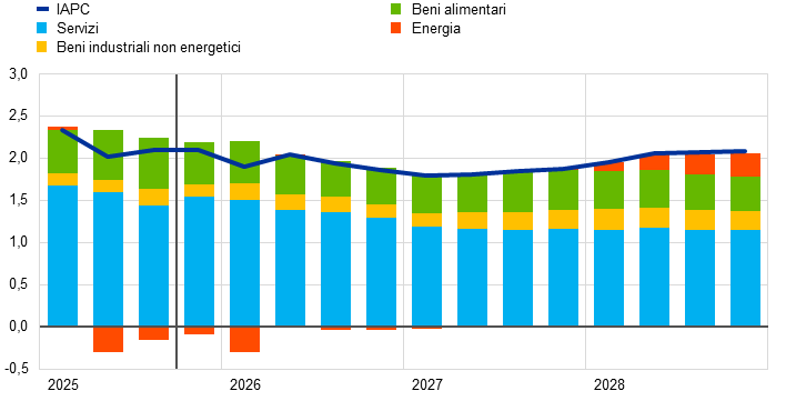 L’inflazione dovrebbe ridursi dal 2,1% nel 2025 all’1,9% nel 2026 e quindi all’1,8% nel 2027, per poi salire all’obiettivo di medio periodo della BCE del 2% nel 2028. L’attesa diminuzione dell’inflazione complessiva (misurata sull’indice armonizzato dei prezzi al consumo, IAPC) all’inizio del 2026 riflette un effetto base al ribasso riconducibile ai prezzi dei beni energetici, mentre per le componenti non energetiche l’inflazione dovrebbe continuare ad attenuarsi per tutto il 2026. Il contributo della componente energetica all’inflazione complessiva dovrebbe rimanere contenuto fino alla fine del 2027, per poi aumentare notevolmente nel 2028 per effetto della prevista attuazione del nuovo sistema dell’UE per lo scambio di quote di emissione (ETS2), con un impatto al rialzo di 0,2 punti percentuali sull’inflazione complessiva. L’inflazione misurata sullo IAPC al netto dei beni energetici dovrebbe diminuire dal 2,5% nel 2025 al 2,2% nel 2026 e al 2,0% nel 2027 e nel 2028. Per quanto riguarda la componente dei beni alimentari, l’inflazione si ridurrebbe sensibilmente con l’attenuarsi degli effetti dei precedenti rincari delle materie prime alimentari a livello mondiale e delle condizioni meteorologiche avverse nel corso dell’estate, per poi stabilizzarsi su livelli lievemente superiori al 2% a partire dalla fine del 2026. L’inflazione misurata sullo IAPC al netto delle componenti energetica e alimentare (HICPX) dovrebbe mostrare una moderazione passando dal 2,4% nel 2025 al 2,0% nel 2028, man mano che diminuirà l’inflazione nei servizi, con l’attenuarsi delle spinte dal lato del costo del lavoro, e il passato apprezzamento dell’euro si trasmetterà lungo la catena di formazione dei prezzi, frenando l’inflazione dei beni. La crescita salariale dovrebbe continuare a perdere slancio fino al 2026, prima di stabilizzarsi a circa il 3%, supportata dalla tenuta dei mercati del lavoro e da un’espansione della produttività appena inferiore all’1%. La crescita del costo del lavoro per unità di prodotto dovrebbe attenuarsi, anche se l’impatto sull’inflazione sarebbe in parte compensato da una graduale ripresa dei margini di profitto nell’orizzonte di proiezione. Rispetto all’esercizio dello scorso settembre, le prospettive per l’inflazione complessiva misurata sullo IAPC sono state rivedute al rialzo di 0,2 punti percentuali per il 2026, di riflesso a recenti dati inattesi per l’inflazione misurata sullo IAPC e la crescita salariale, che nel caso di quest’ultima hanno determinato una notevole revisione al rialzo delle prospettive salariali. Le proiezioni per l’inflazione misurata sullo IAPC sono state riviste leggermente al ribasso per il 2027, per effetto dell’ipotesi di un minore contributo fornito dalla componente energetica, in quanto ora ci si attende un rinvio dell’attuazione dell’ETS2 dal 2027 al 2028, anche se tale contributo sarebbe in parte compensato da una maggiore inflazione nei servizi.